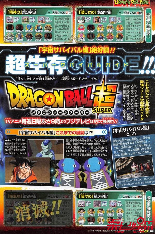 大概翻译:除了第7宇宙外,第6宇宙最为安全,还剩下不少选手。第11宇宙还有最强的3人组合,将会给悟空带来什么样的挑战?第2宇宙的里布里安有着极大的愤怒,等待着找17号报仇!除此之外,第二宇宙还有亚德拉星人(瞬间移动), 滋夫尔人(贝比)